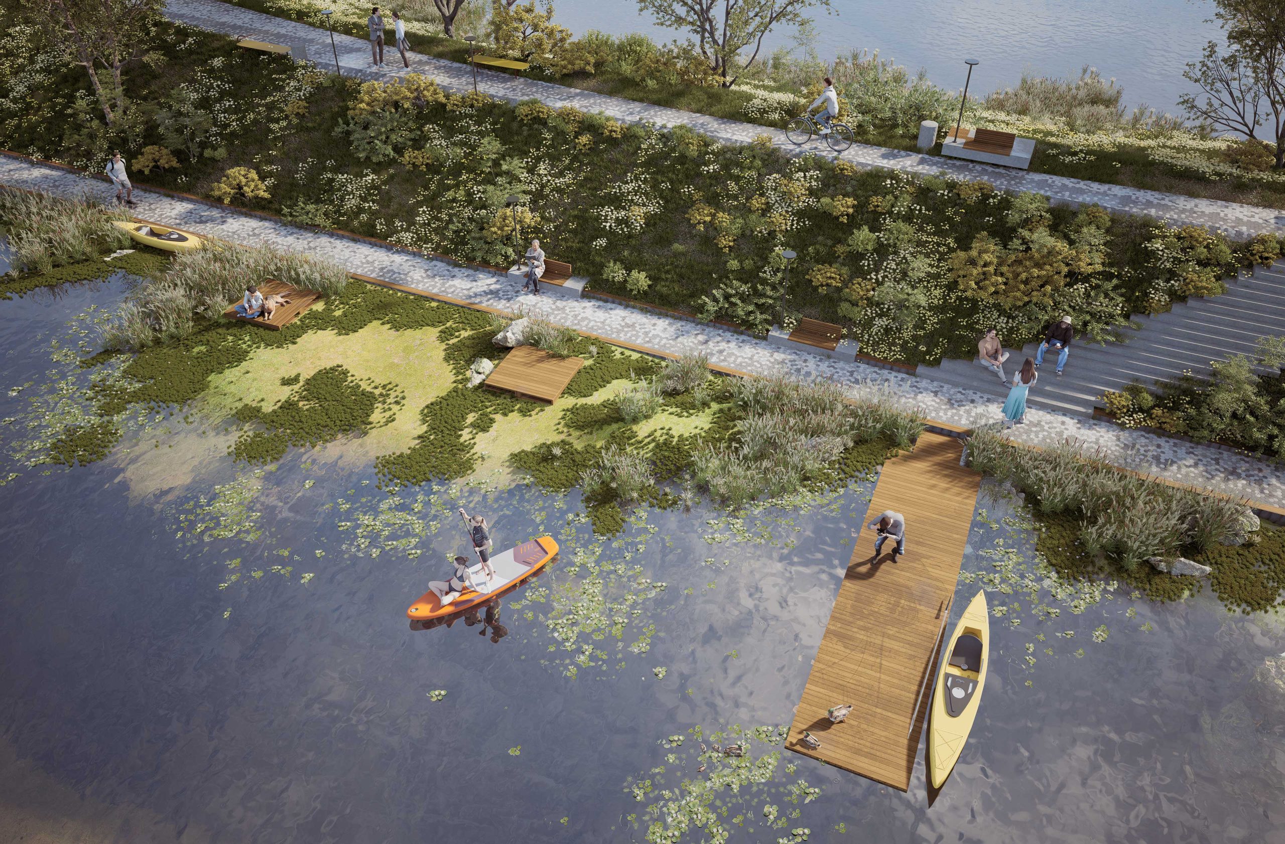 Nowa przestrzeń publiczna, obejmująca promenadę wzdłuż Jeziorki oraz szlak przyrodniczy w obrębie planowanego zbiornika wody