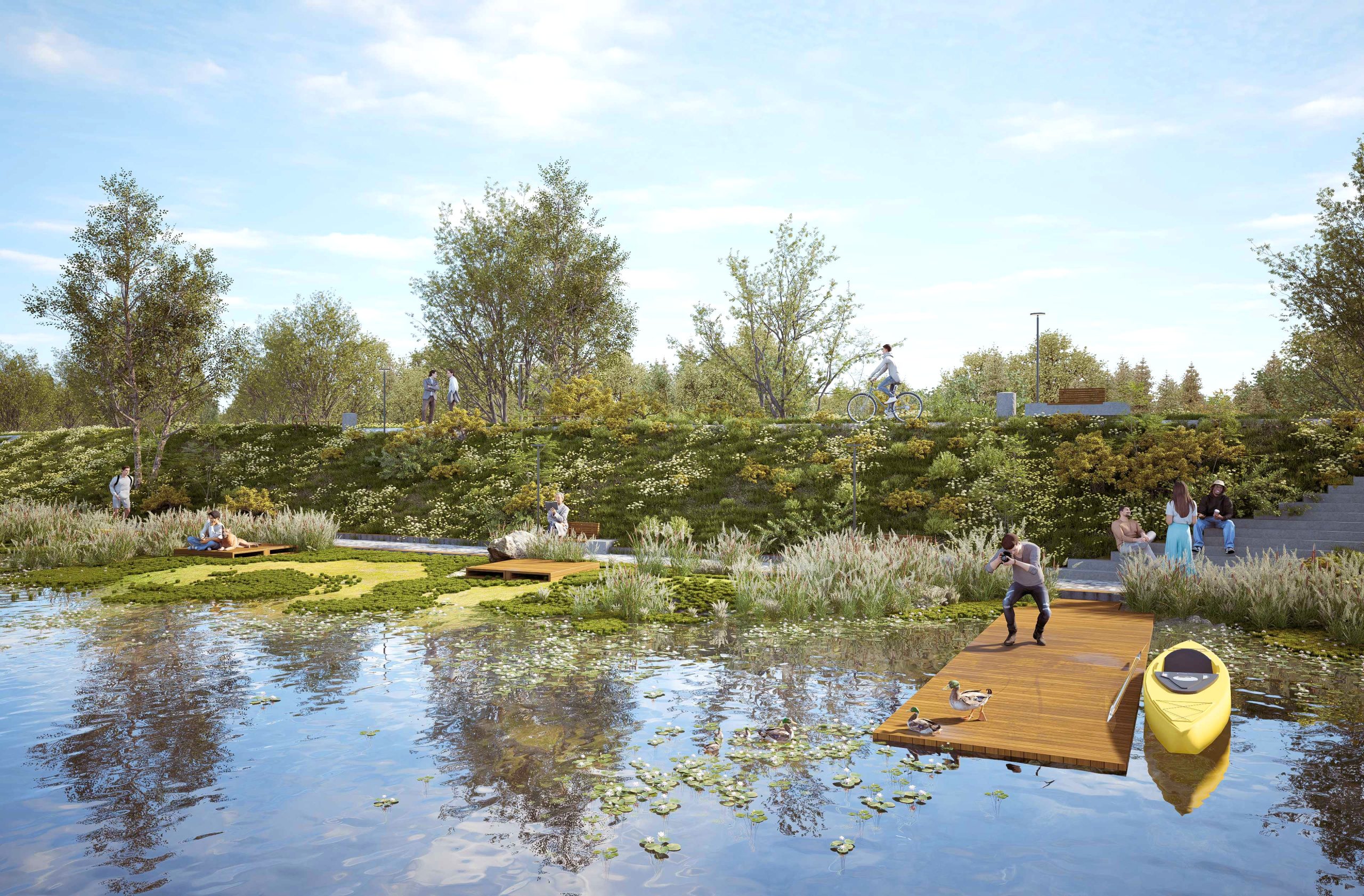 Centralnym punktem proponowanego założenia jest utworzenie zbiornika wodnego w otoczeniu dzikiej przyrody oraz budowa promenady pomiędzy wałem wzdłuż rzeki Jeziorki i nowym zbiornikiem.